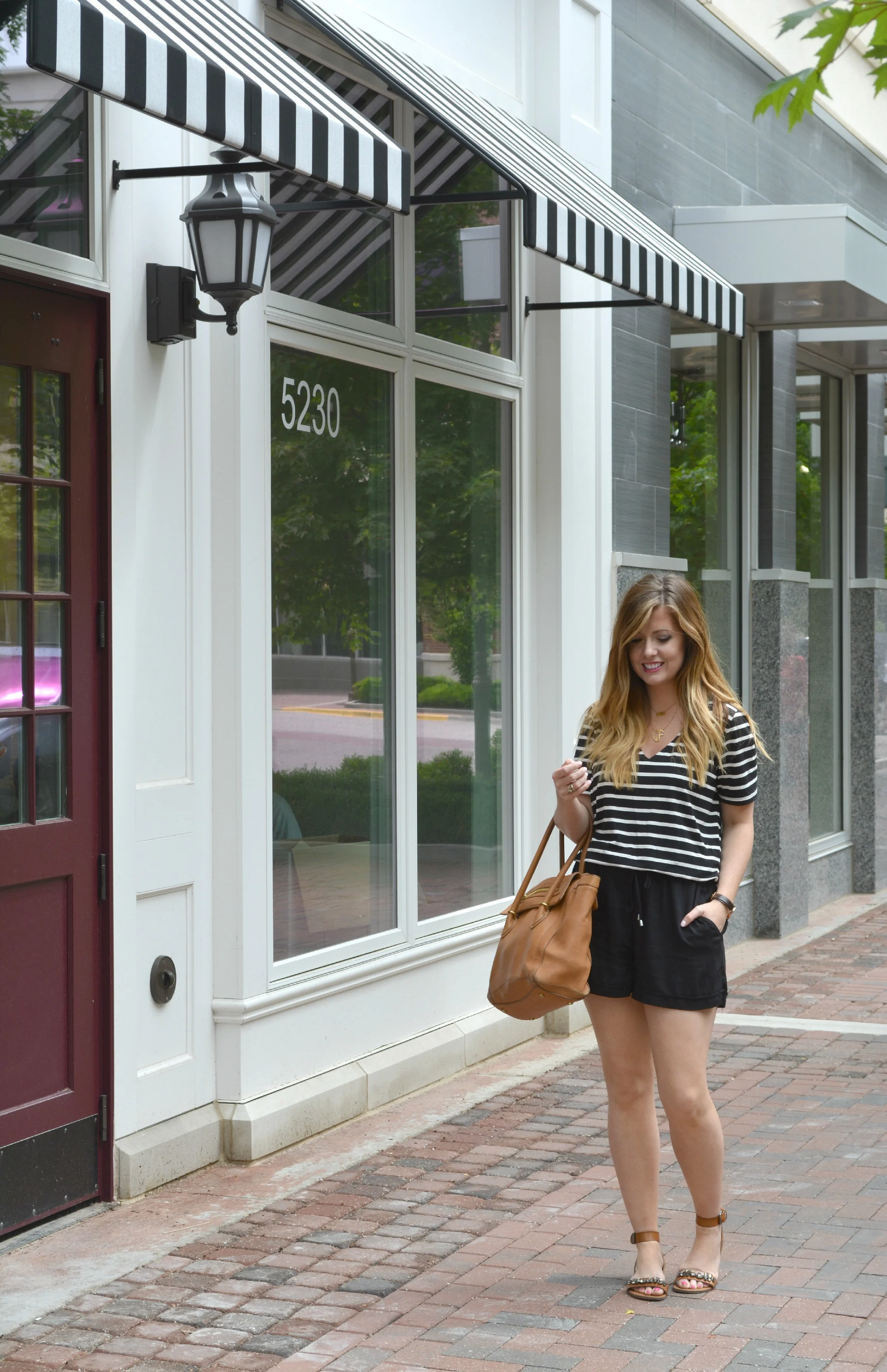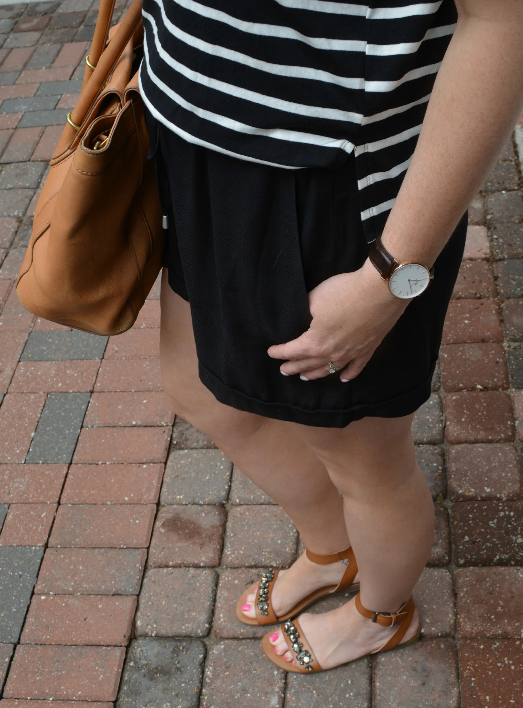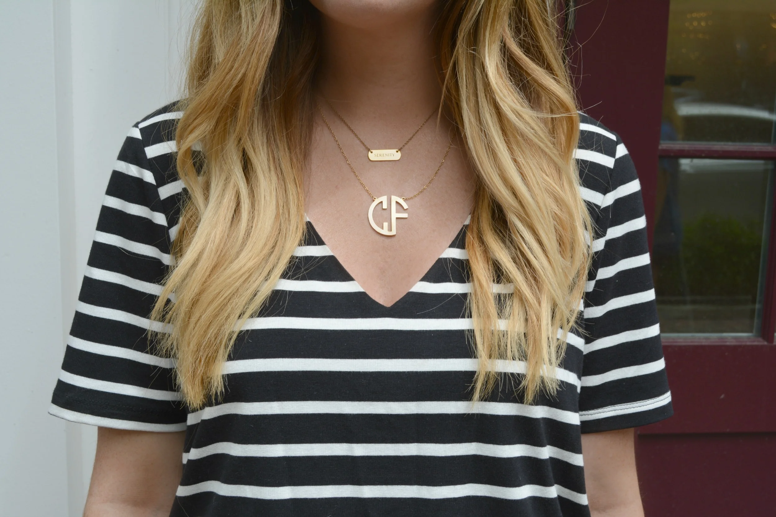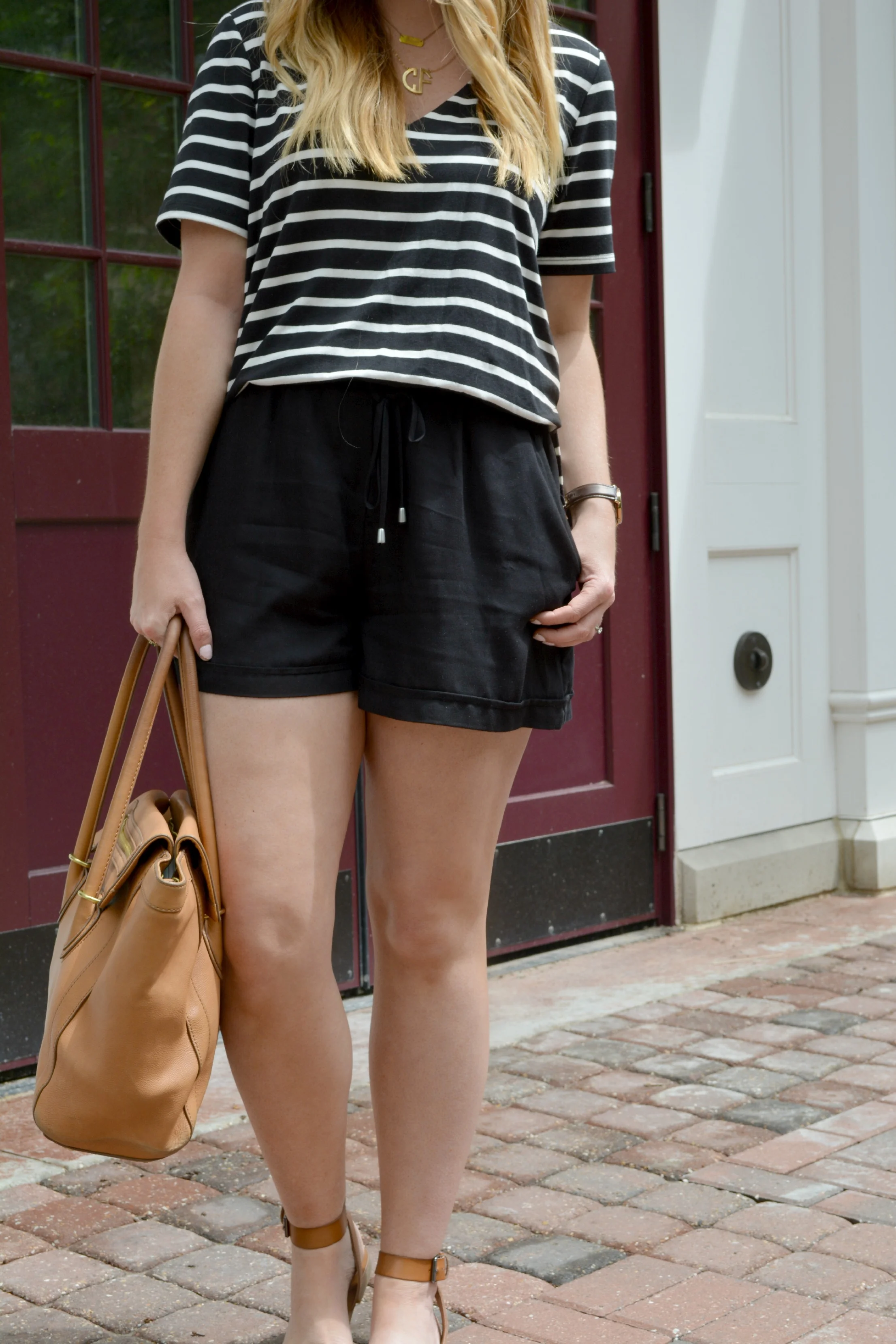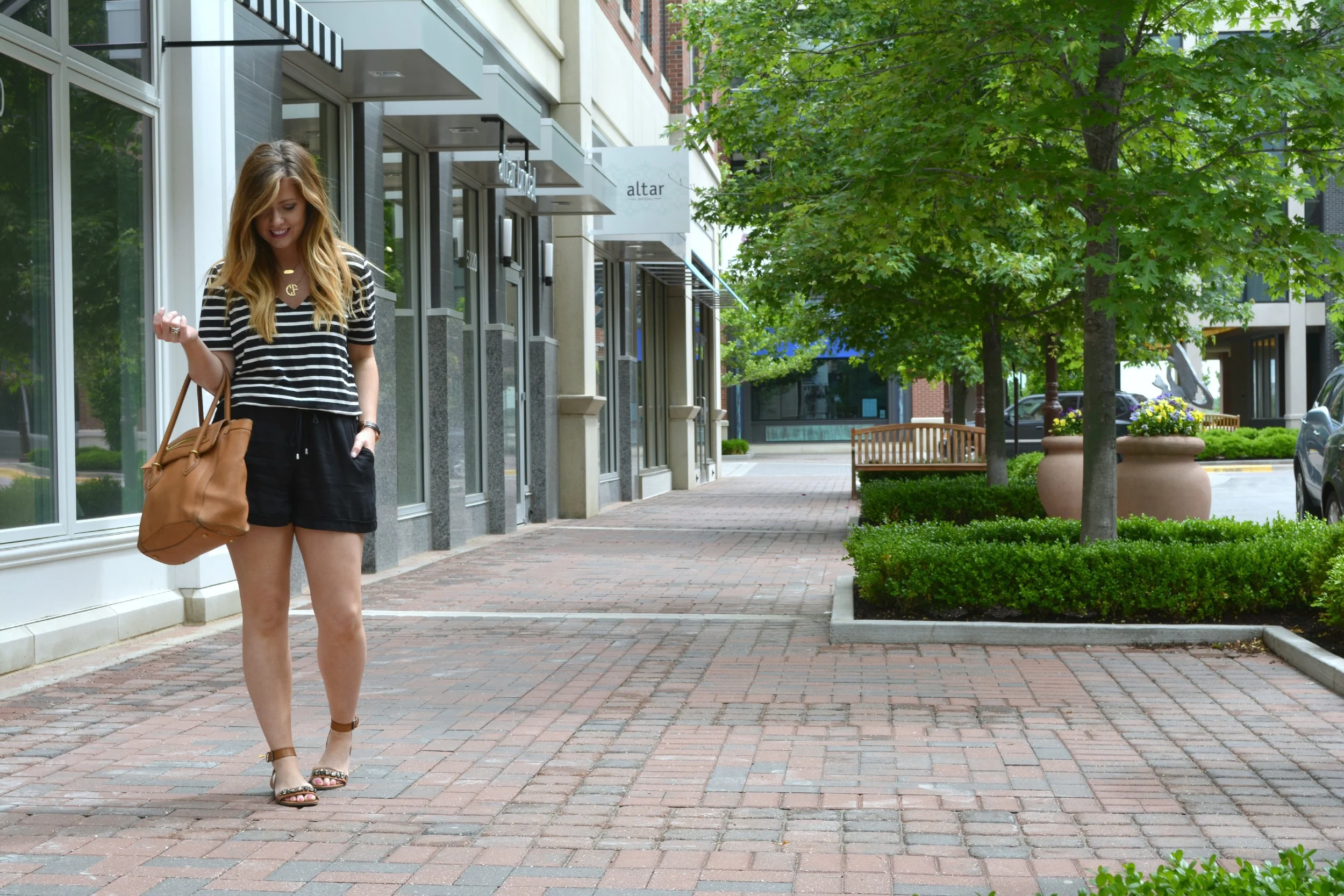 Anthropologie romper (stripe option in store) same style here, J.Crew bag (old) similar here and here, Target sandals, Daniel Wellington watch, Engraveable necklace, and Monogram necklace, and AE sunnies