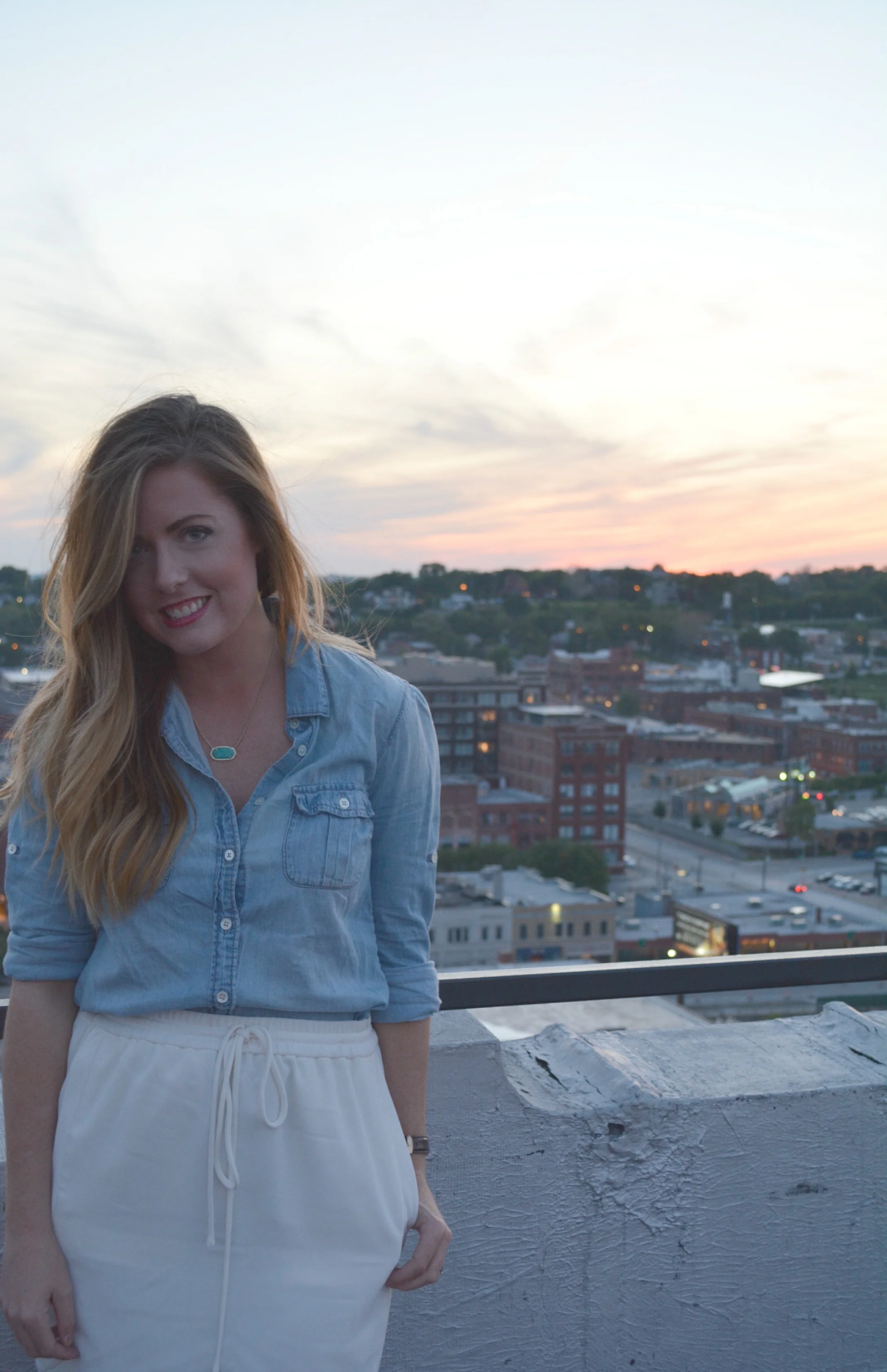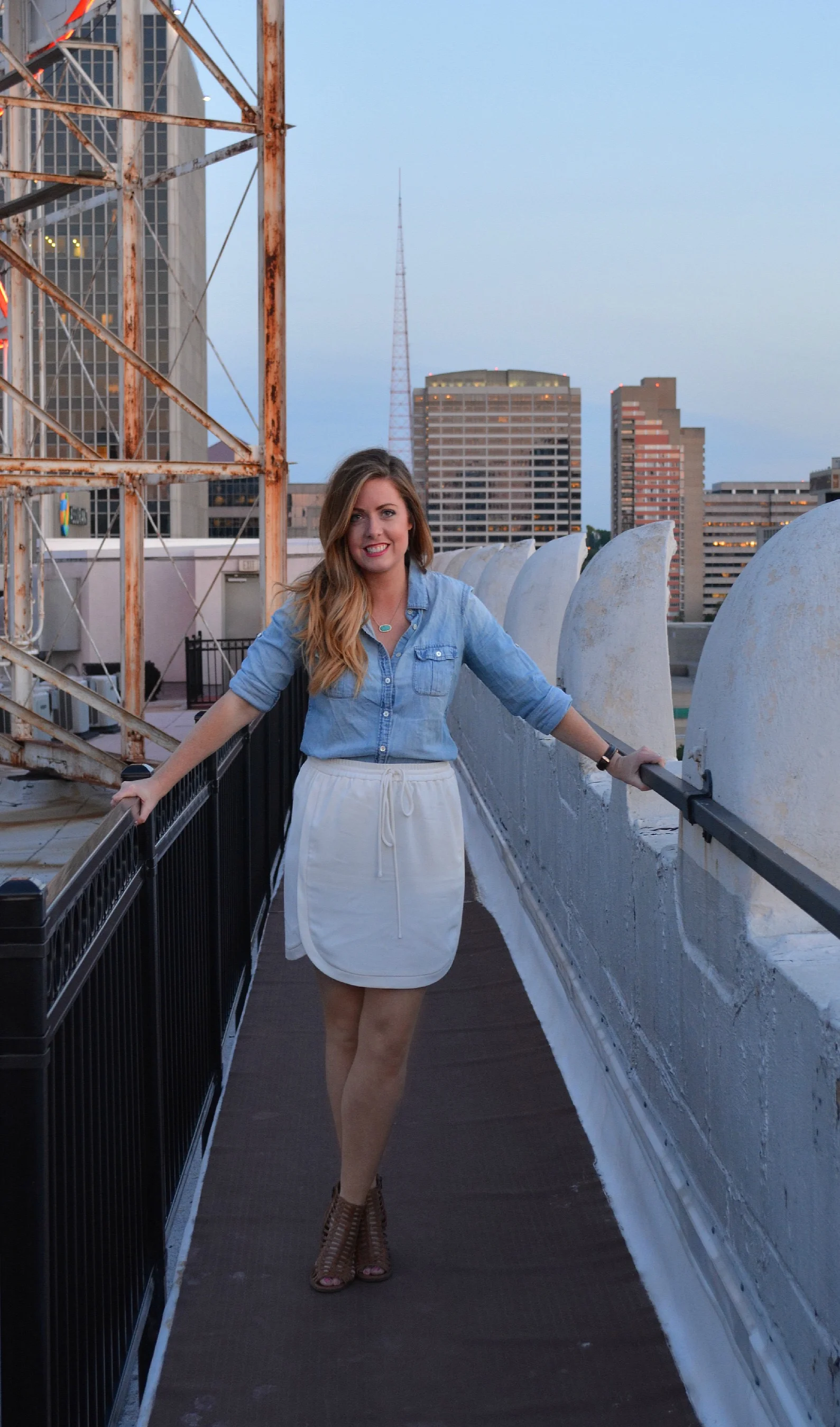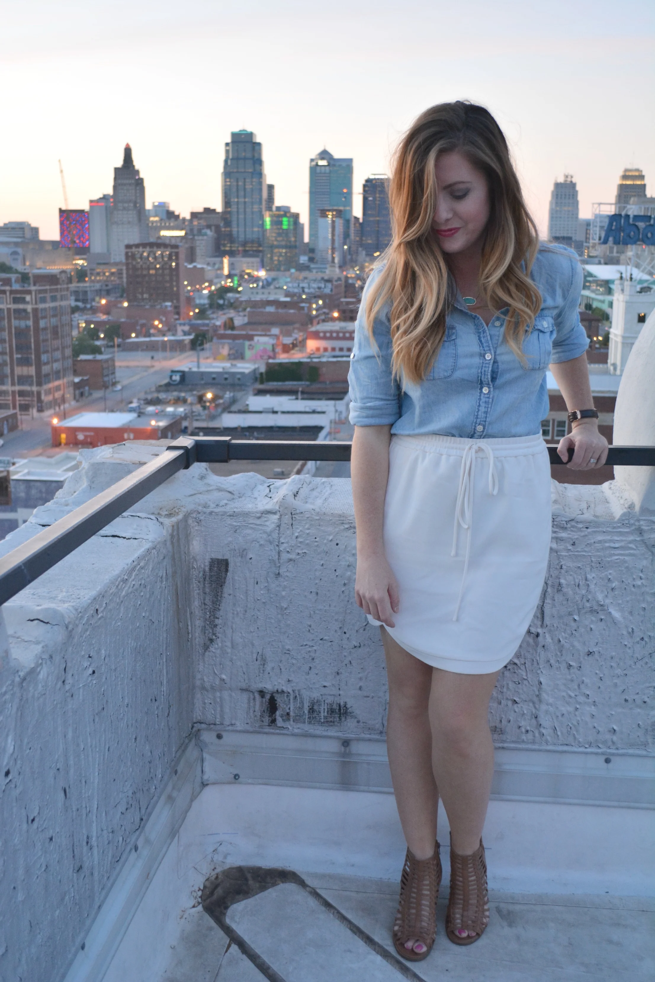 STYLE TIP: When heading to a casual dinner know you can totally wear a casual chambray shirt with a great skirt and sandals. Wear a top that you would wear with shorts during the day and throw on a skirt you love for dinner. And be sure to add a pair of shoes you just love and can walk in!