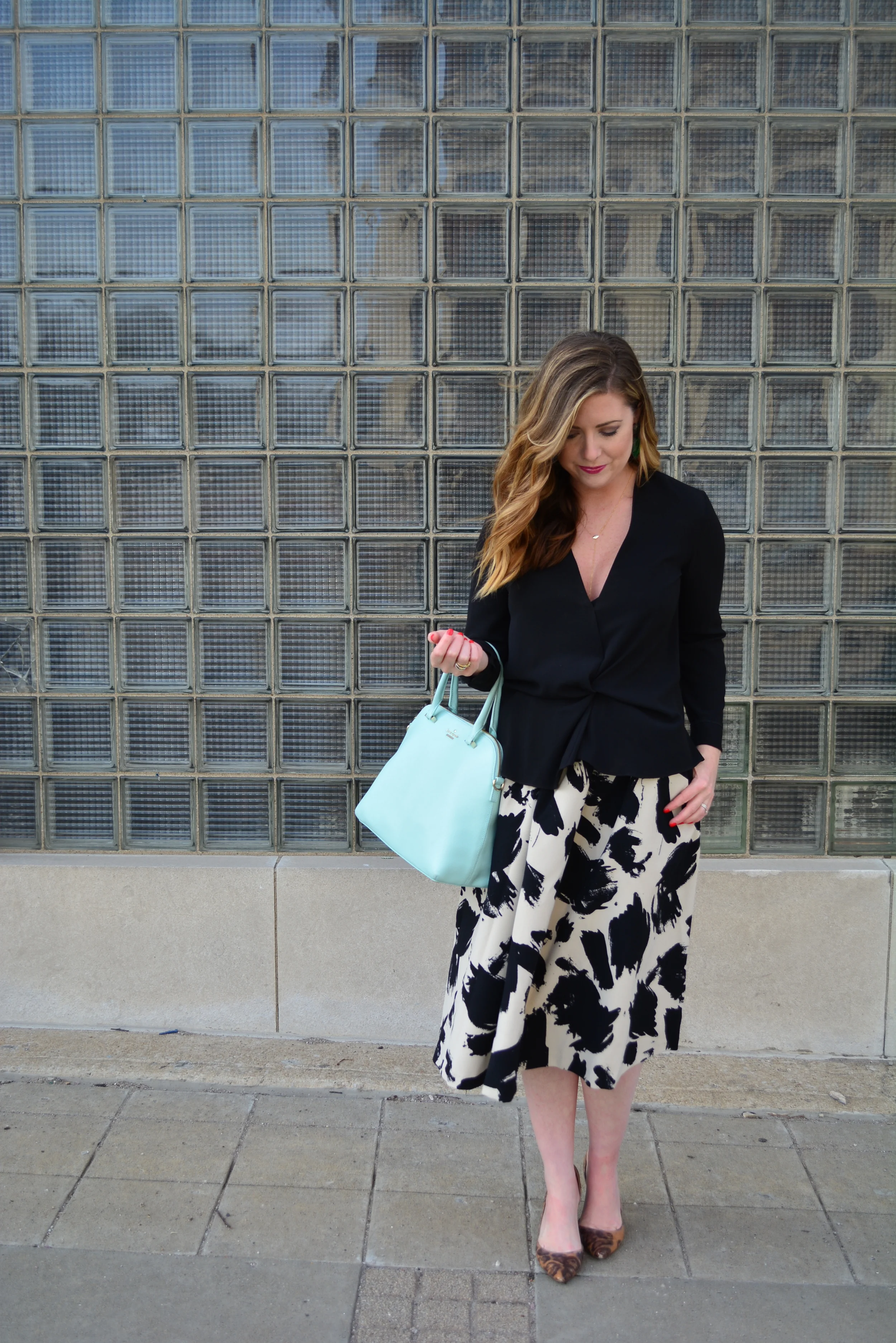 When Kate Spade (now Valentine, more on that in a few) says she's coming to Kansas City to premiere her new shoe and handbag line Frances Valentine at Hall's. You MAKE IT HAPPEN! And once it's on your calendar you obviously need to pick out an outfit, right!? Let's talk about how intimidating this felt. I mean, hello, it's Kate-Freaking-Spade! So I started with this midi skirt that is an oldie but a goodie and knew it felt classy enough yet cool, just like her. I then tried on a bunch of different tops and knew it needed to be something with with some sassy. And one thing this top has is sass!! Then leopard of course had to be added and a Kate Spade handbag of course!