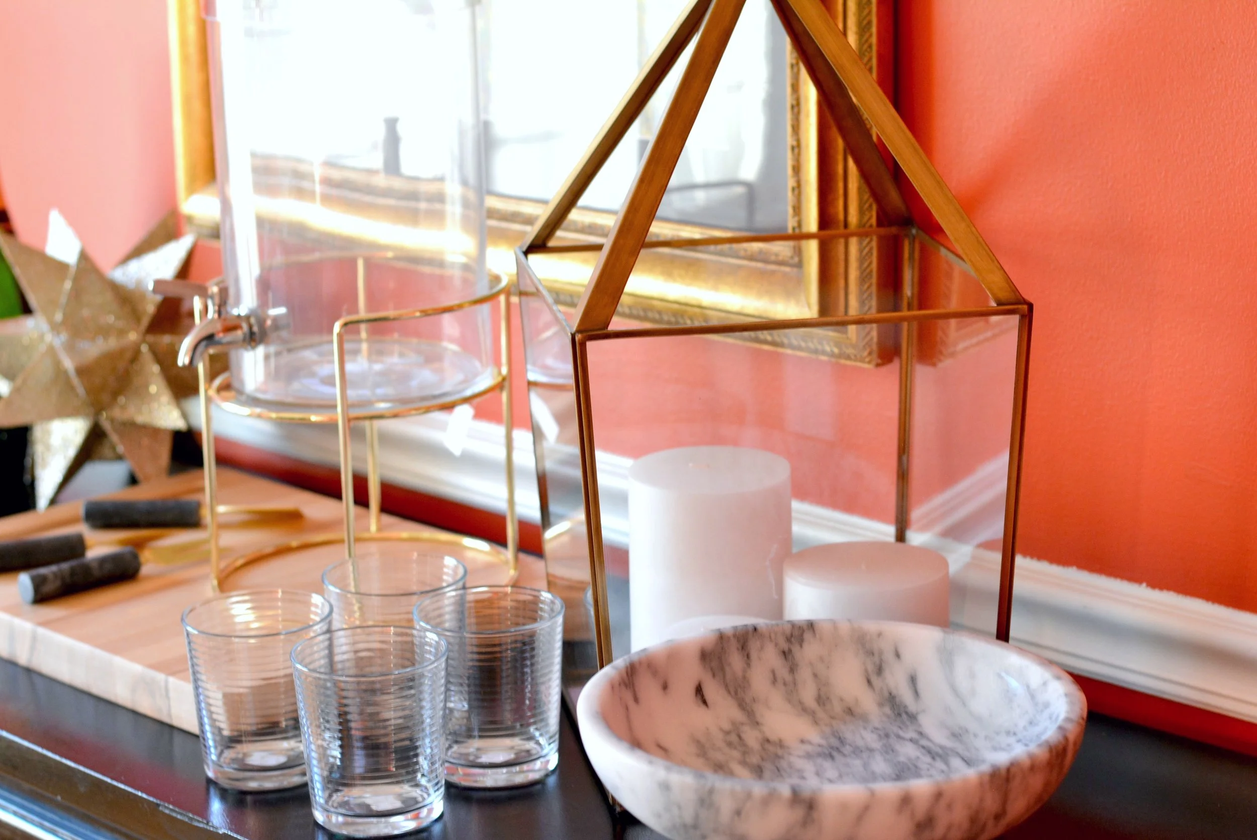 That I had to grab two and put one on the buffet table too! This buffet table isn't really all that big so we usually serve drinks and small bites off of it. I started this layout with the glass drink dispenser, the gold stand, classic cups, glitter tree topper, tiered tray, cutting board, gold lantern with white pillar candles, marble bowl, and finally the cheese knives. I love how all the gold elements played so nicely with the white, black, and grays of all the Crate and Barrel decor. And how it all coordinated well with the orange, white, gold and black items already in the dining room! AND of course my outfit! ;)