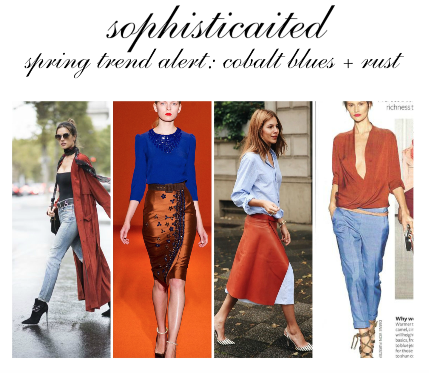 I have been spying some killer looks from New York Fashion Week, and the color combo that I can't stop thinking about is, cobalt blues and rusty browns. I love how you can mix the really rich tones of the browns and bronzes with the light summery blues to create such a unique color combo. And the fact that blue and orange are complementary colors, basically mean nature intended this to happen (lol). Therefore they will always look great together, promise. I also love all the tones of orange you can play with here: rust, rose gold, tan, bronze, and cognac too. All of those rich tones do look SO good with the blues. My favorite blues are also: subtle baby blues, chambray, periwinkles, bright cobalts, and the gray navy tones too. I love how this color combo can also be fun for work and play! I encourage you to play with these tones and have fun with them this spring. Check out my inspiration for this post below and shop my favorite pieces you can find at Town Center, above!