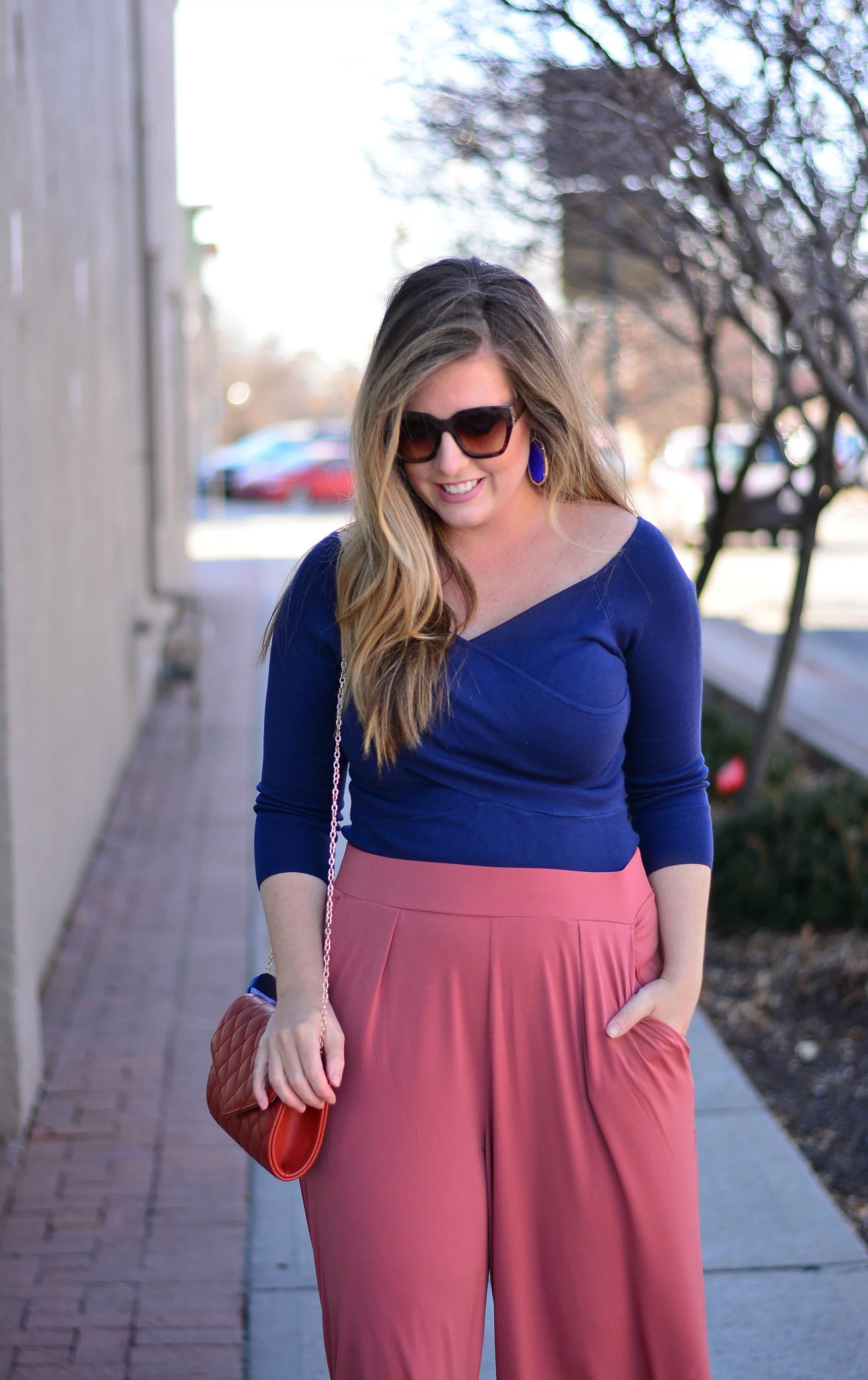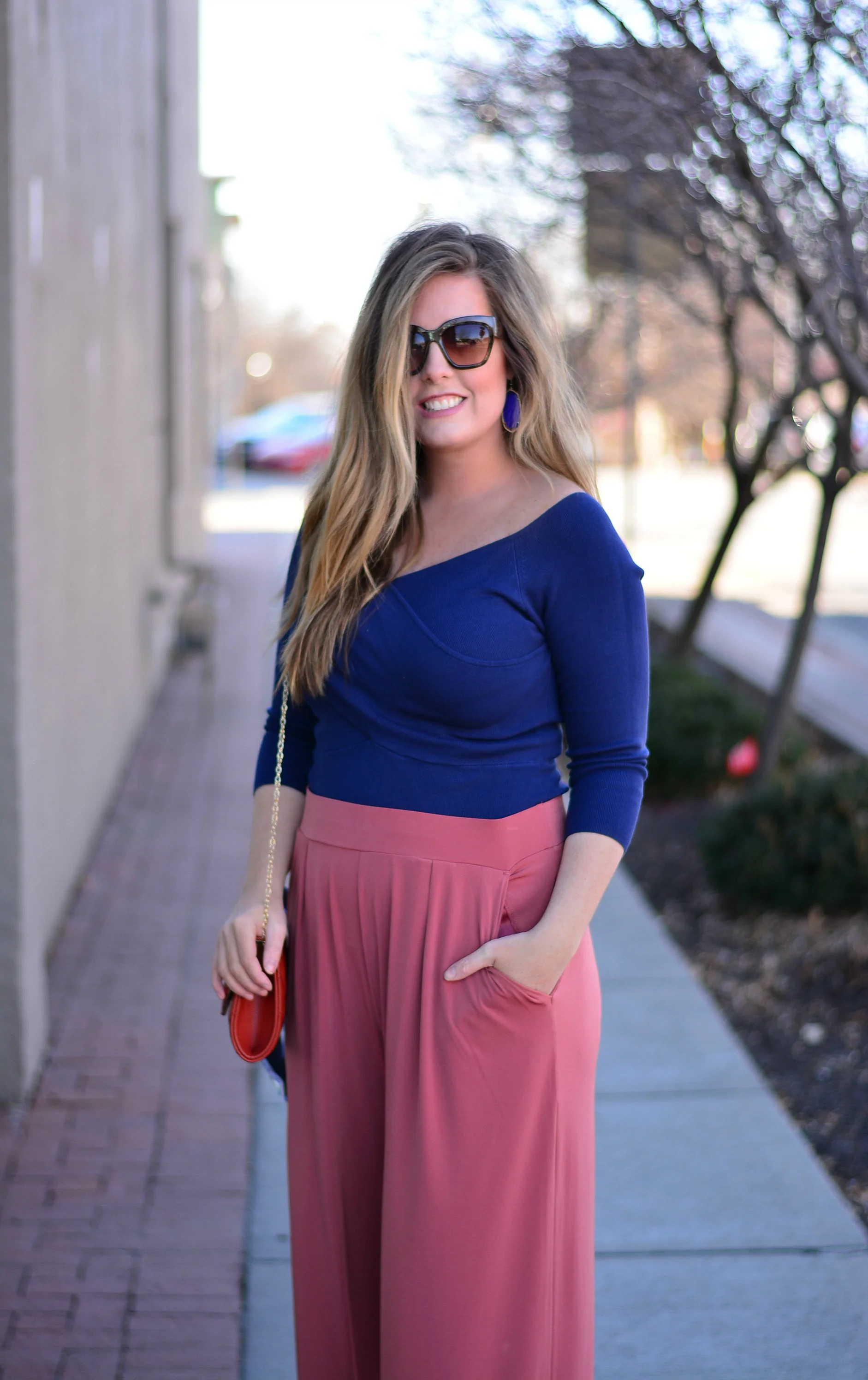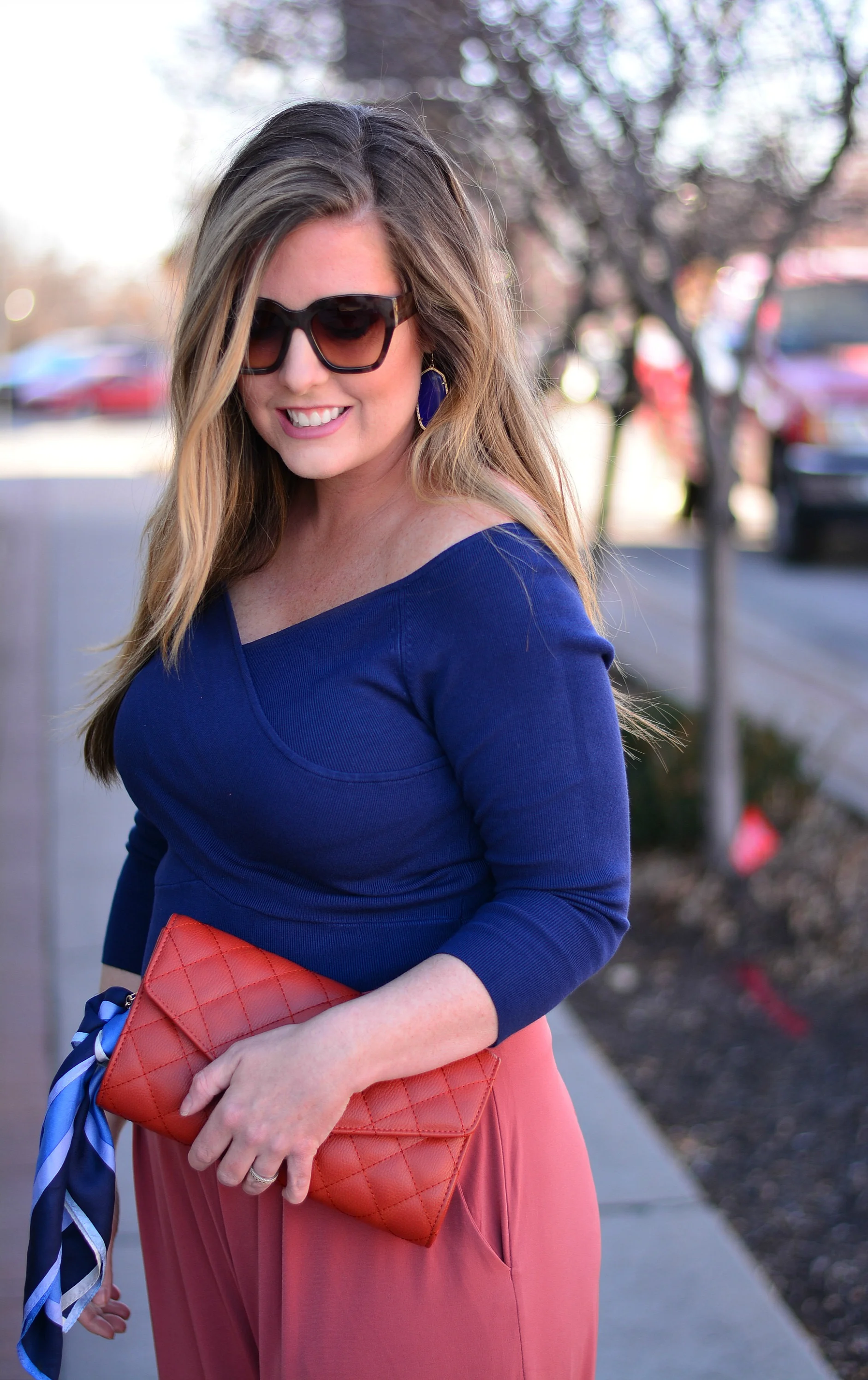 Top: Express | Pants: Express | Earrings: Kendra Scott | Clutch: Charming Charlie |
