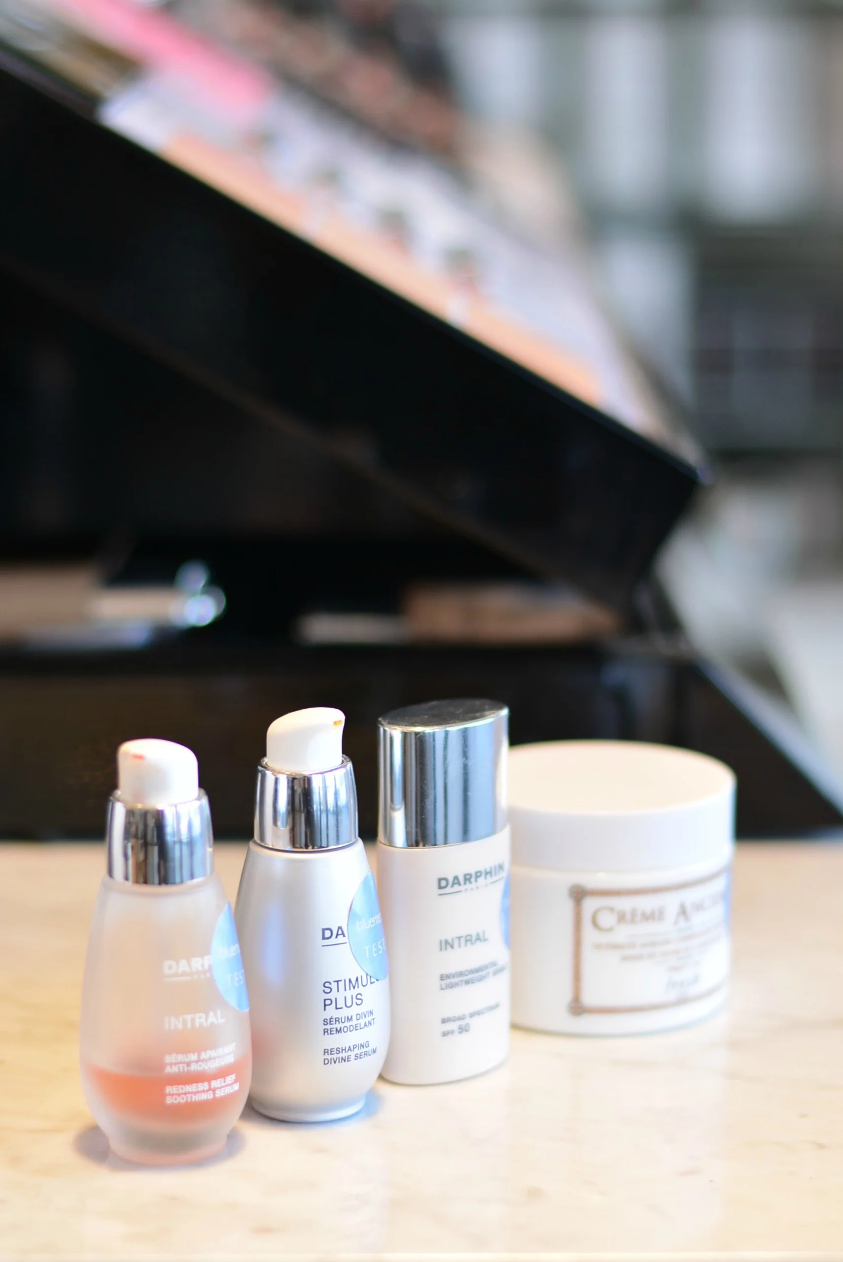 I got asked a few questions about Adult Acne and what they recommended to help fight it. And essentially acne is formed from oily, clogged pours, so here's what they said would help: m-61 PowerSpot Pad, Cleanance Mat Toner, Cleanance Expert, and Cleanance Cleansing Gel. And they also recommended Darphin intral redness relief soothing serum (cuts down on redness, like immediately), Darphin stimulskin plus reshaping divine serum, Darphin Intral moisturizer, and Fresh crème ancienne. Fun fact #2: Serums are like vitamins for your face. A little messy, sure. But good for you! So go take some:)