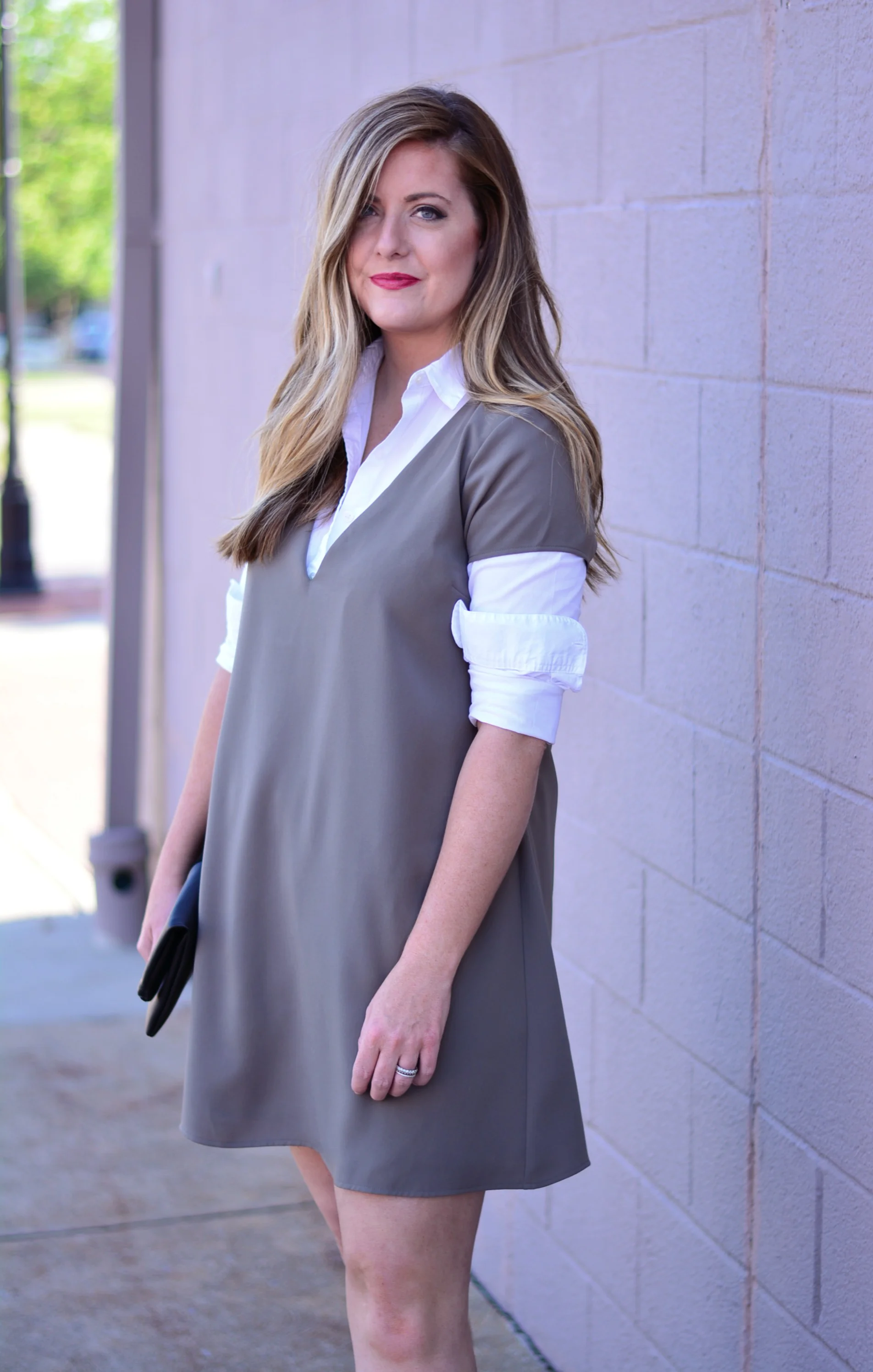 When it comes to staying modest, I feel like layering appropriately is the way to go. But, I'm never a big fan of wearing tank tops underneath tops and dresses. Ya know what I mean? I just feel like the line the tank top creates, just cuts off the look. So, I thought I'd steal a styling note from my J.Crew days. I grabbed one of my favorite white button down tunics and threw it on underneath the adorable shift dress. When I first ordered this dress, I knew I would love the short sleeves, and shifty-flare skirt of the dress, but, I was a little weary of the deep v. As the girls are way larger than they used to be, the cleve can be out of control and not even on purpose. Ya know what I mean? So the white shirt layering trick totally made this look work!