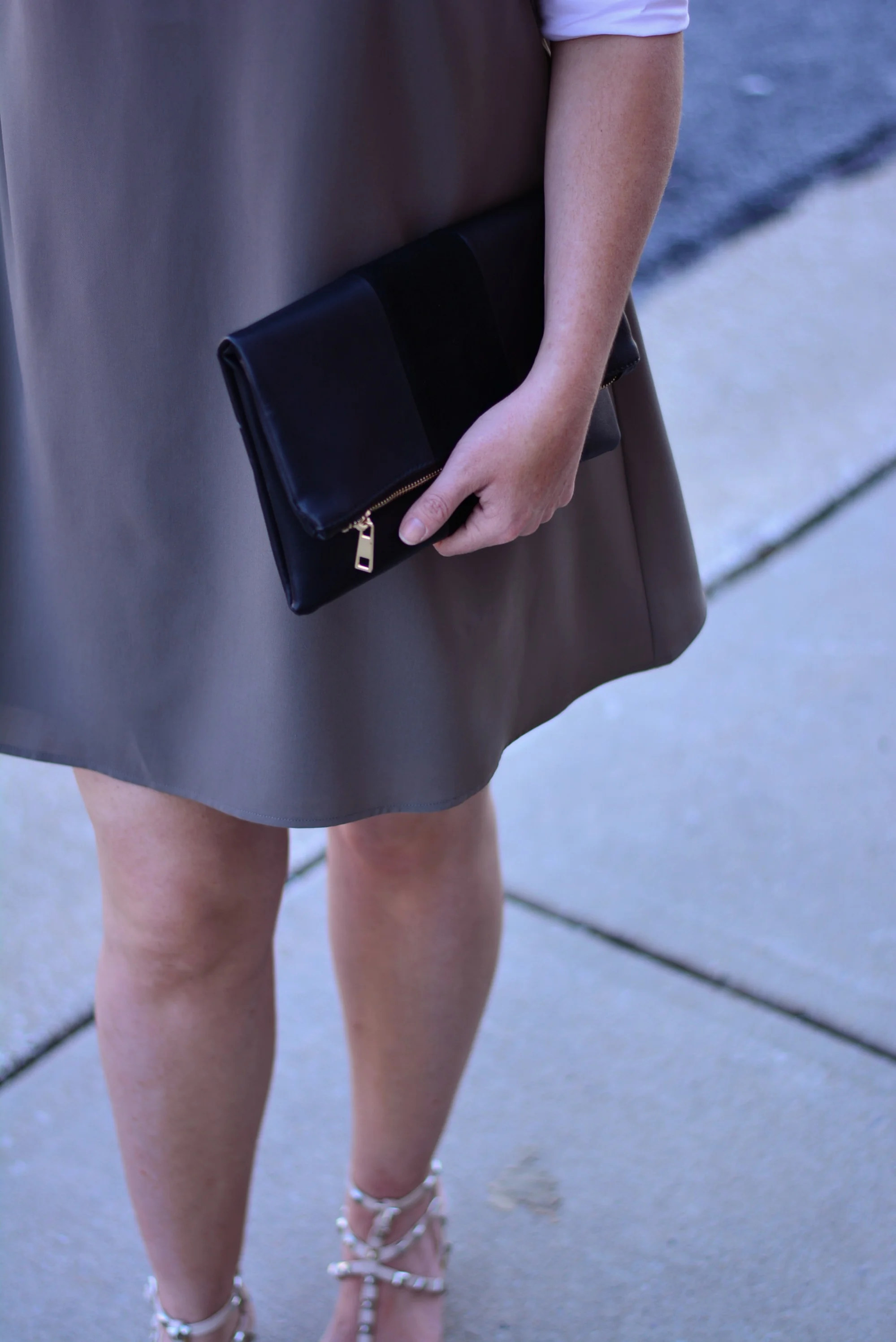 Dress: Tobi c/o | Shirt: Gap | Clutch: Nordstrom | Earrings: TGT | Shoes: DSW (old) similar here and here