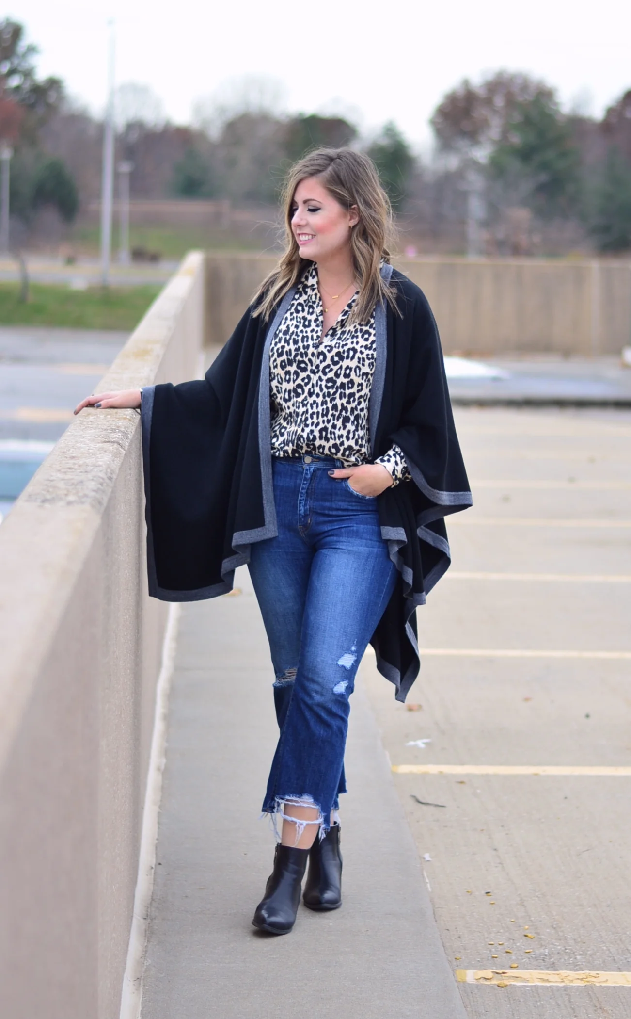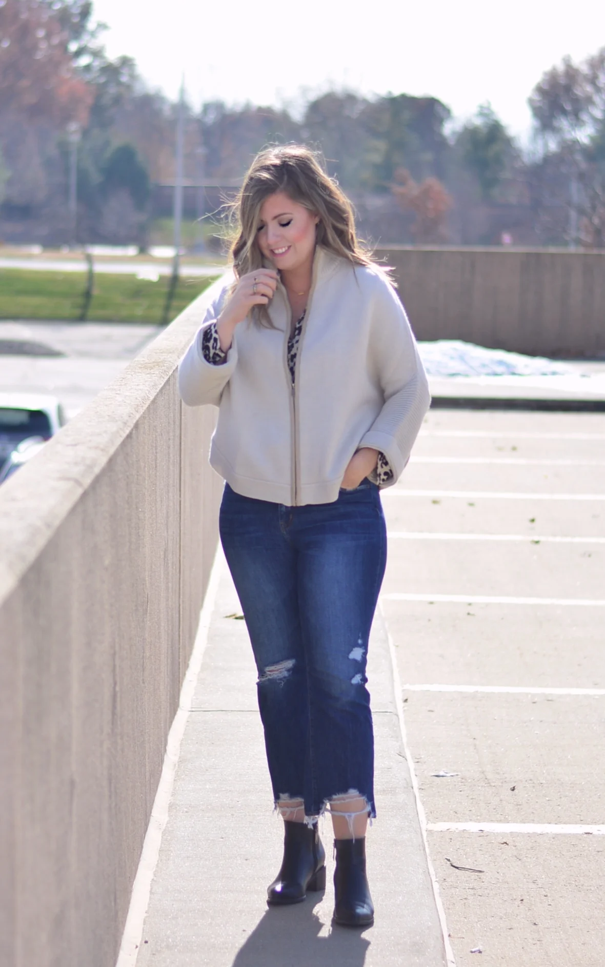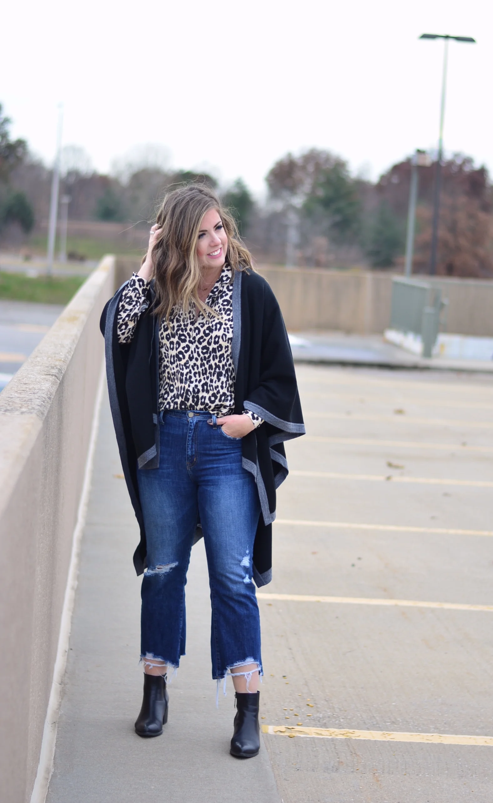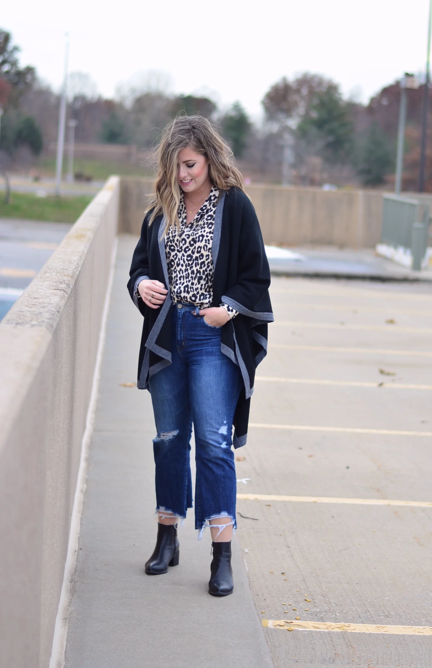 Travel Sweater: Mersea from Kindred | Sport Wrap: Mersea from Kindred | Leopard Shirt: Nordstrom | Jeans: Addie Rose | Booties: Nordstrom | Mama Necklace: Sierra Winter Jewelry | Evil Eye Necklace: SIerra Winter Jewelry